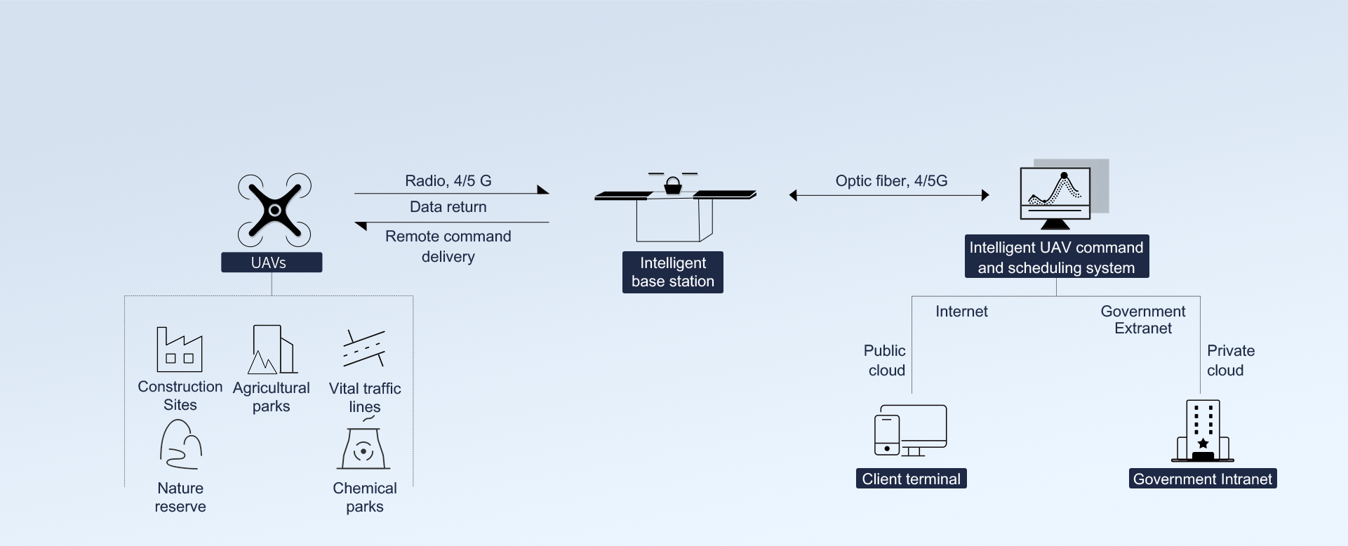 The UAV is mounted with dual-optical camera, loudspeaker , atmospheric sniffer, and multi-spectral camera in the process of automatic cruising, gathering diversified data from multiple sources.